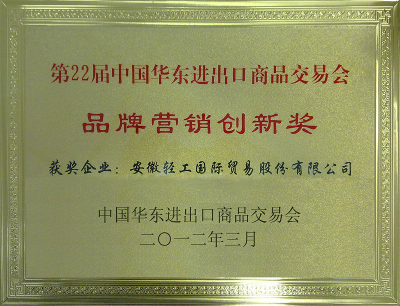 | 2012年03月 公司榮獲第22屆中國華東進出口商品交易會品牌營銷創新獎。 | |