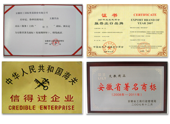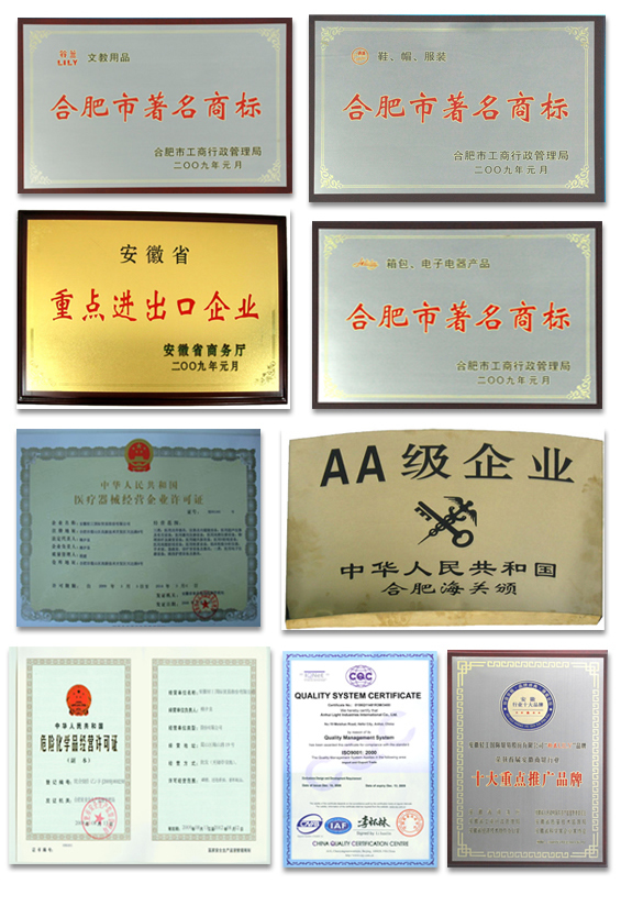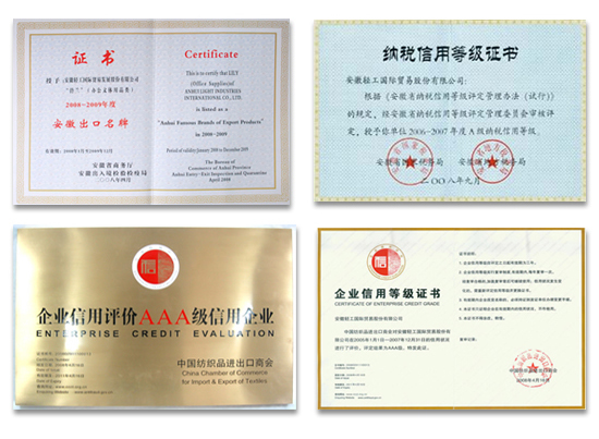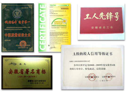 | 2011年12月 公司榮獲商務廳孵化優秀幫扶單位稱號 2011年06月 “假日”商標再次榮獲“安徽省著名商標”稱號 2011年03月 公司榮獲“首批對非出口誠信守法企業”稱號 |