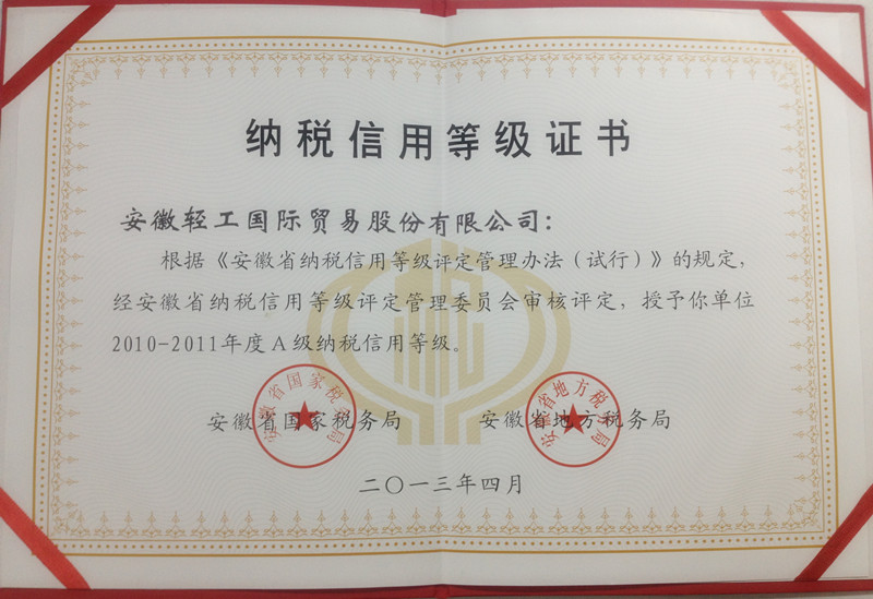 | 2013年09月 公司再次榮獲A級納稅單位榮譽稱號。 | ![]() |
