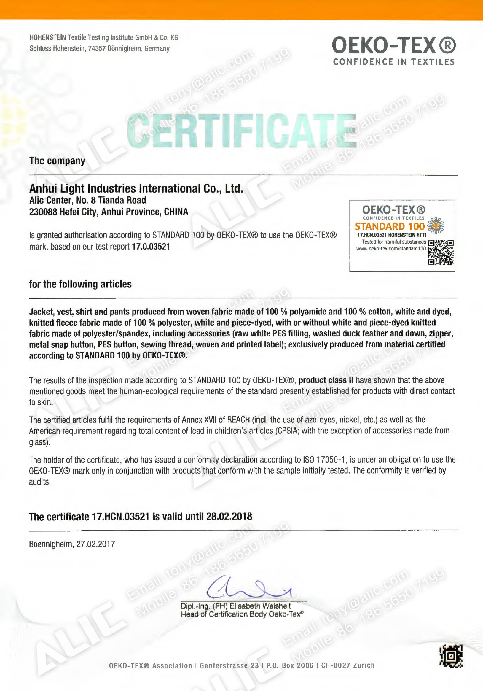 | 2017年3月,公司獲得oeko-tex+100(服裝類)認證 | ![]() |