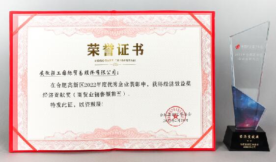 | 2023年2月 榮獲合肥市高新區2022年度經濟貢獻獎。 | ![]() |