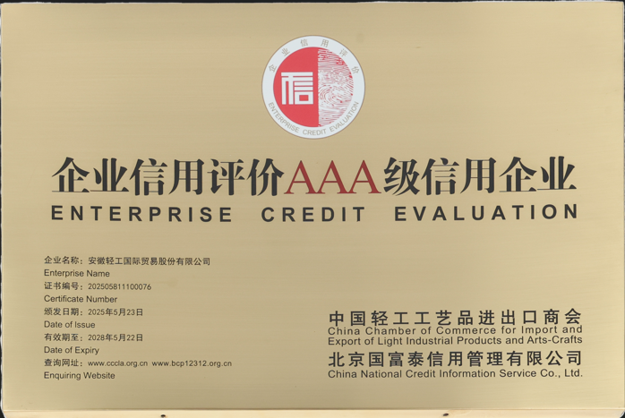 | 2025年5月 公司榮獲中國輕工工藝品進出口商會授予的“企業信用評價AAA級信用企業”榮譽稱號。 | ![]() |