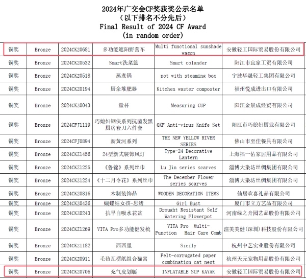 近日,備受行業內矚目的2024年廣交會設計創新獎(以下簡稱CF獎)評選結果正式揭曉,輕工國際自主研發的“充氣皮劃艇”與“多功能遮陽野營車”兩款創新產品,在眾多作品中脫穎而出,雙雙斬獲銅獎!這已是輕工國際第二次獲得CF獎項,也是本次安徽省唯一一家獲此獎項的省屬外貿企業(安徽僅有輕工國際及科大訊飛兩家公司上榜)。